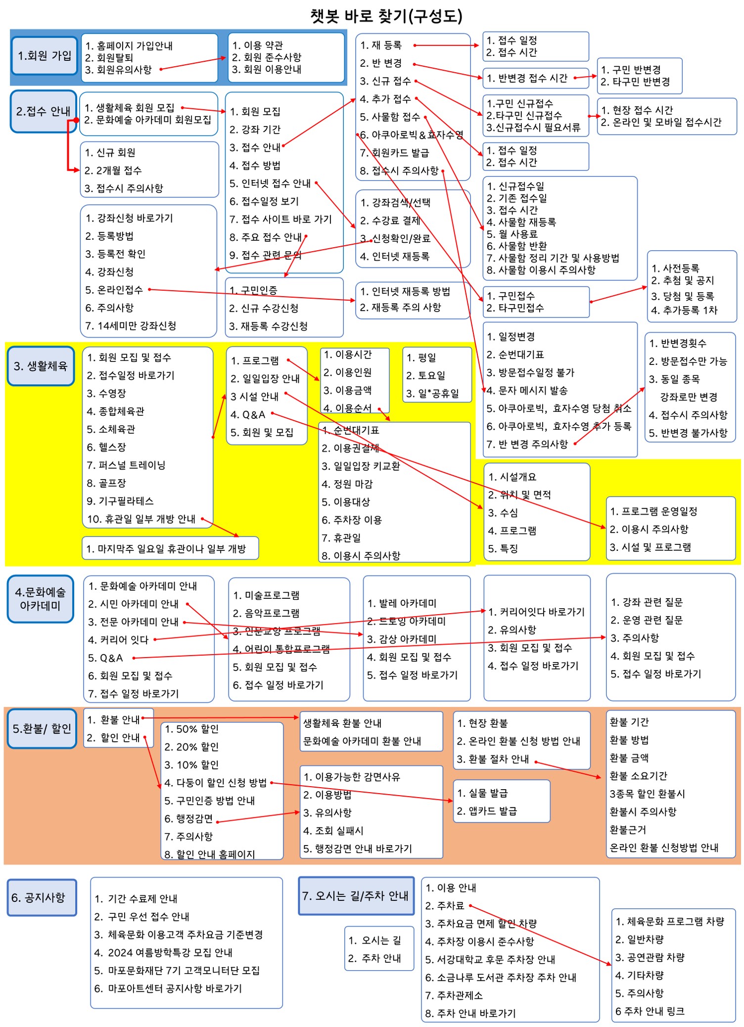 마포아트센터 체육, 문화강좌 챗봇 바로보기_구성도 작성자 관리자 등록일자 2024년 7월 25일 14시 29분 13초 조회 1,213 마포아트센터 체육, 문화강좌 챗봇 을 사용하는데 어디에 내가 찾는 게 있는것을 알려주는 구성도입니다.챗봇 많이 이용해 주세요 그림1.jpg [ Size : 687.36KB , Down : 901 ] 미리보기 다운로드 목록보기